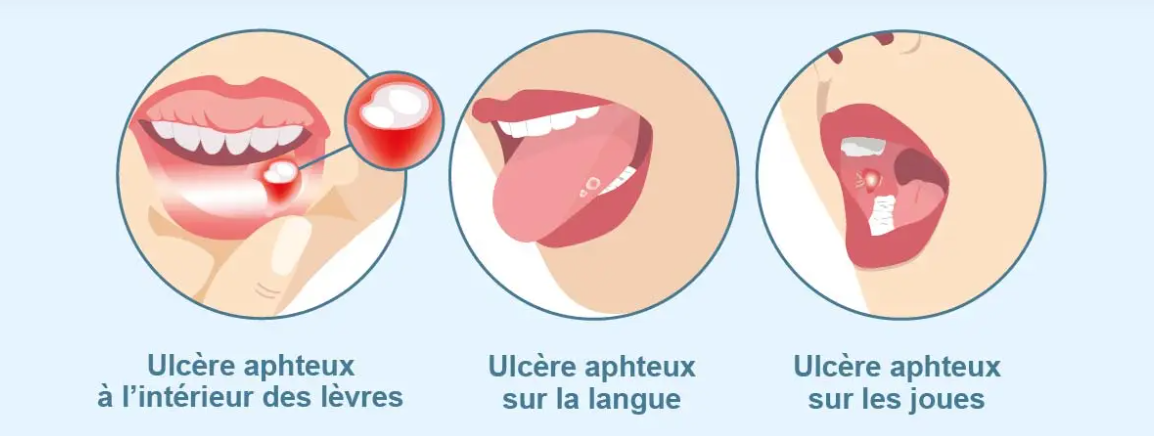 Les aphtes se présentent sous la forme de petites ulcérations blanchâtres, rondes ou ovales, se situant dans la bouche (gencives, sous la langue, intérieur des joues)
