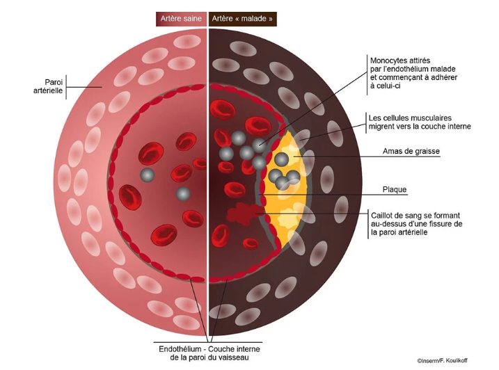 Cette accumulation d'athérome dans les artères ralentit progressivement la circulation du sang, pouvant aller jusqu'à l'obstruction de l'artère concernée, ce qui bloque la circulation sanguine.