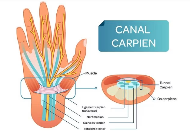 Le canal carpien est un espace situé au niveau du poignet délimité par les os du poignet (carpe) et le ligament de la carpe reliant ces os entre-eux.