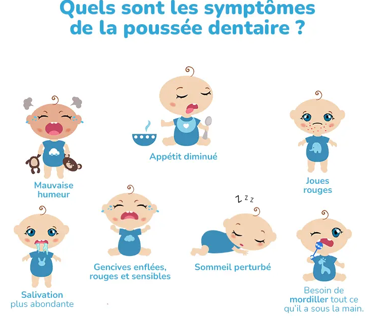 La poussée dentaire se traduit par une petite avancée de la dent dans la gencive, pouvant donner de la fièvre et une hypersalivation.